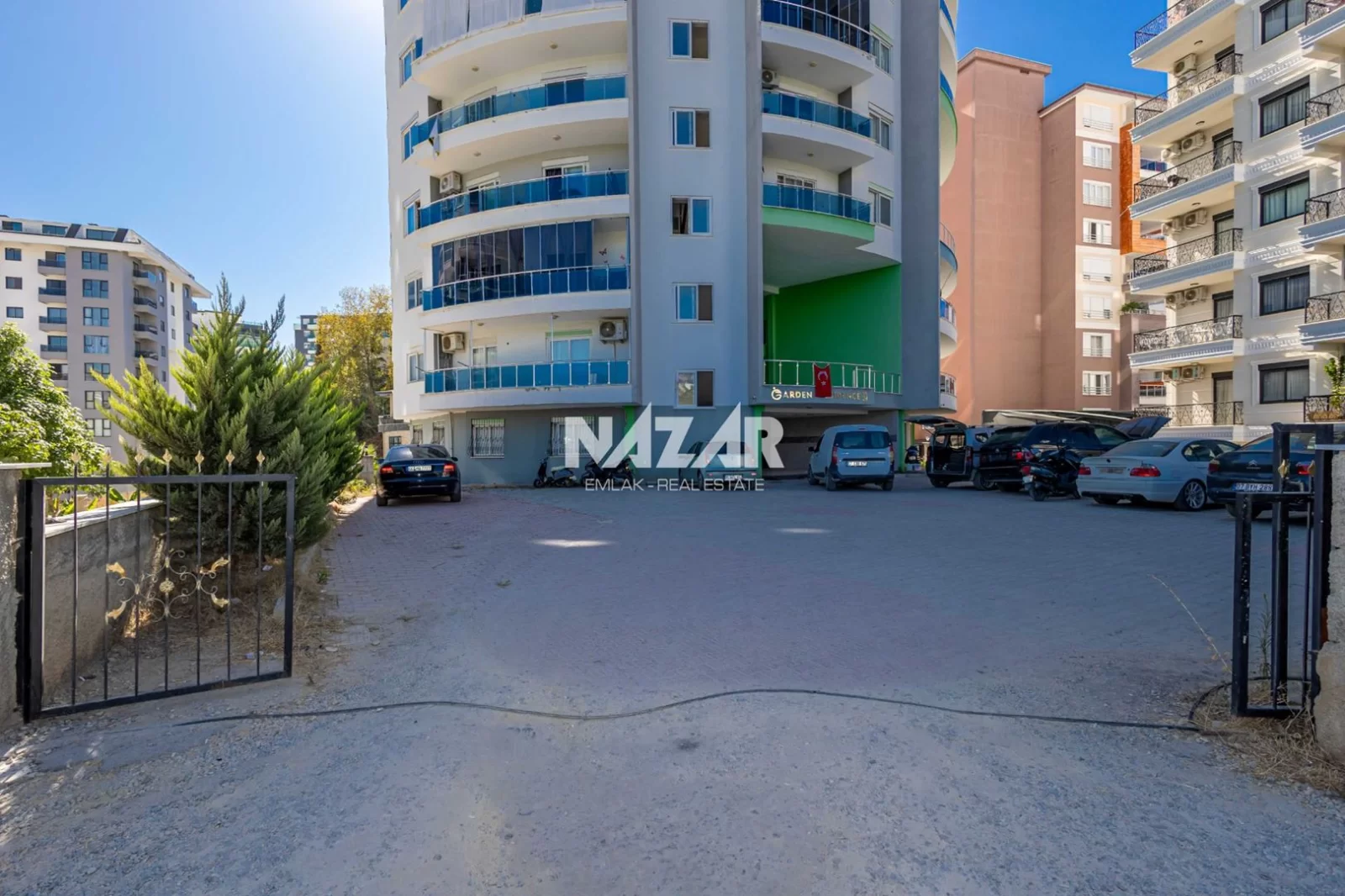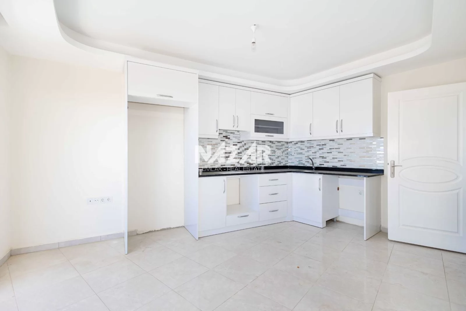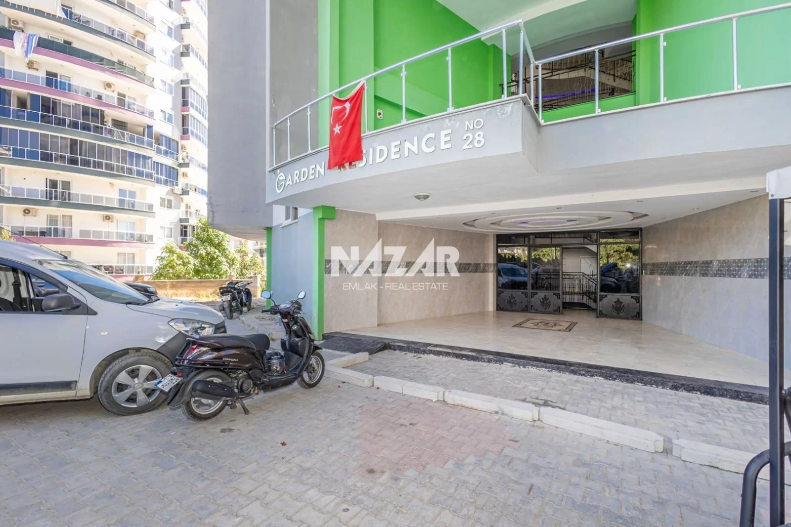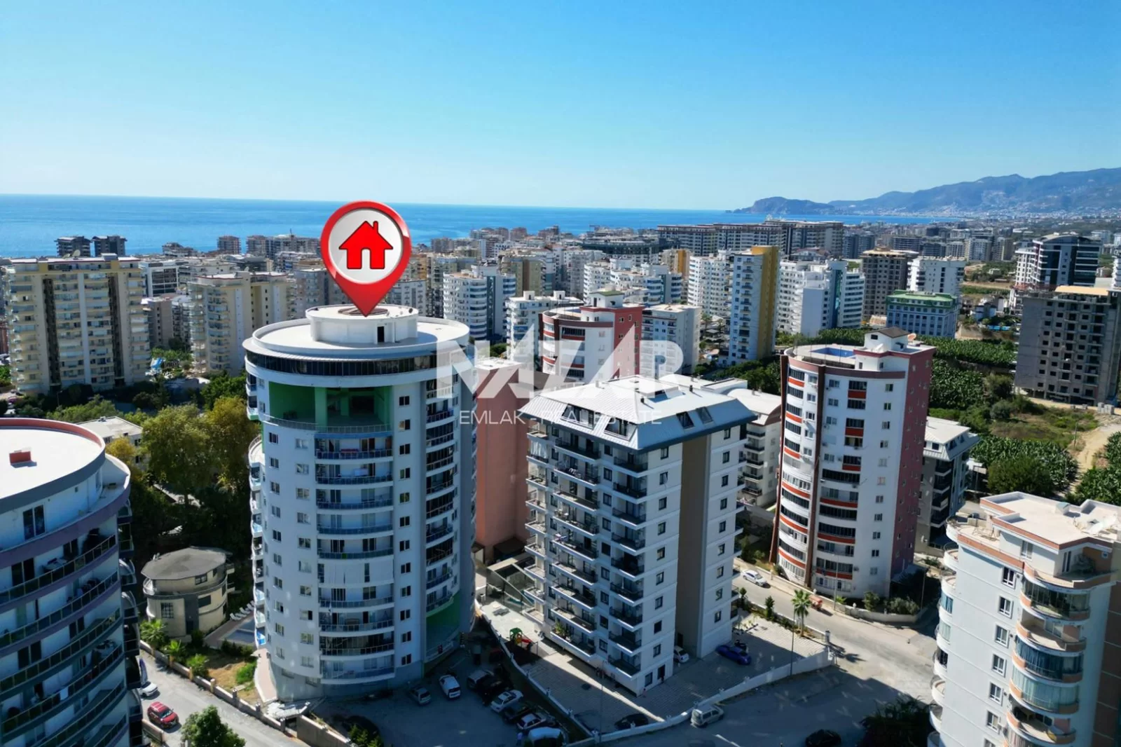 Die Anlage verfügt über soziale Einrichtungen wie einen Außenpool, einen offenen Parkplatz und einen Landschaftsgarten. Außerdem gibt es einen Aufzug, einen Generator, einen Hausmeister, eine Sauna und einen Fitnessraum. Das Meer ist nur 900 Meter entfernt. Diese Wohnung können Sie über Nazar Emlak erreichen.