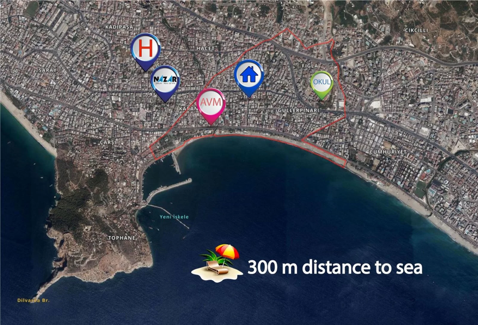 Unsere Wohnung ist nur wenige Gehminuten vom Meer, Marktketten, Krankenhäusern, Schulen und Fitnessstudios entfernt. Sie können diese Mietwohnung, die 300 Meter vom Meer entfernt ist, über Nazar Real Estate erwerben und als erste darin wohnen.